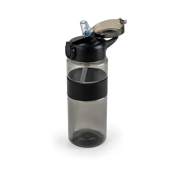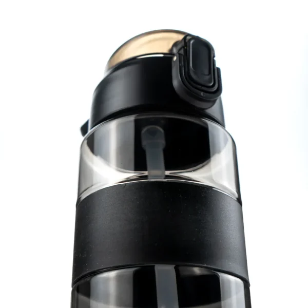- Design: Transparent black bottle with straw, silicon grip, and push-button lid