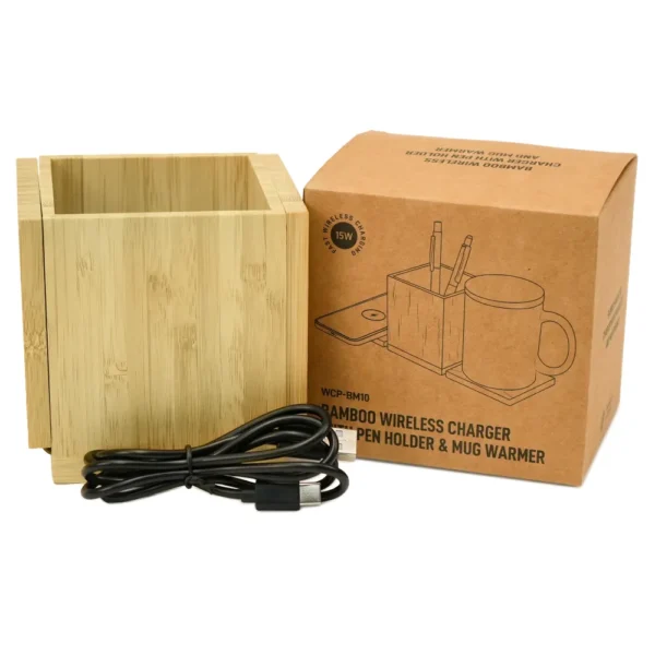 Stay organized and powered up with this stylish Foldable Bamboo Multi-Function Desk Organizer. Made from eco-friendly bamboo, this innovative desk essential combines a 15W fast wireless charger, a mug warmer, and a pen holder—all in one compact, foldable design.