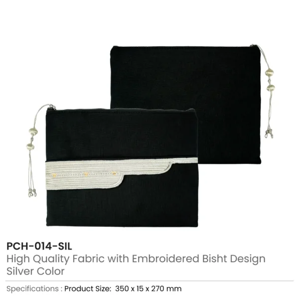 Protect your laptop in style with this elegant Laptop Sleeve Zipper Pouch, featuring exquisite Arabic Bisht design embroidery in gold and silver. Designed for laptops up to 13″, it includes a small interior zipper pocket for accessories. The multi-purpose fabric pouch has a secure zipper closure with a tassel accent, combining functionality with cultural elegance. Ideal for corporate gifts, premium stationery, or personal use. Packaged in bulk cartons for easy distribution.